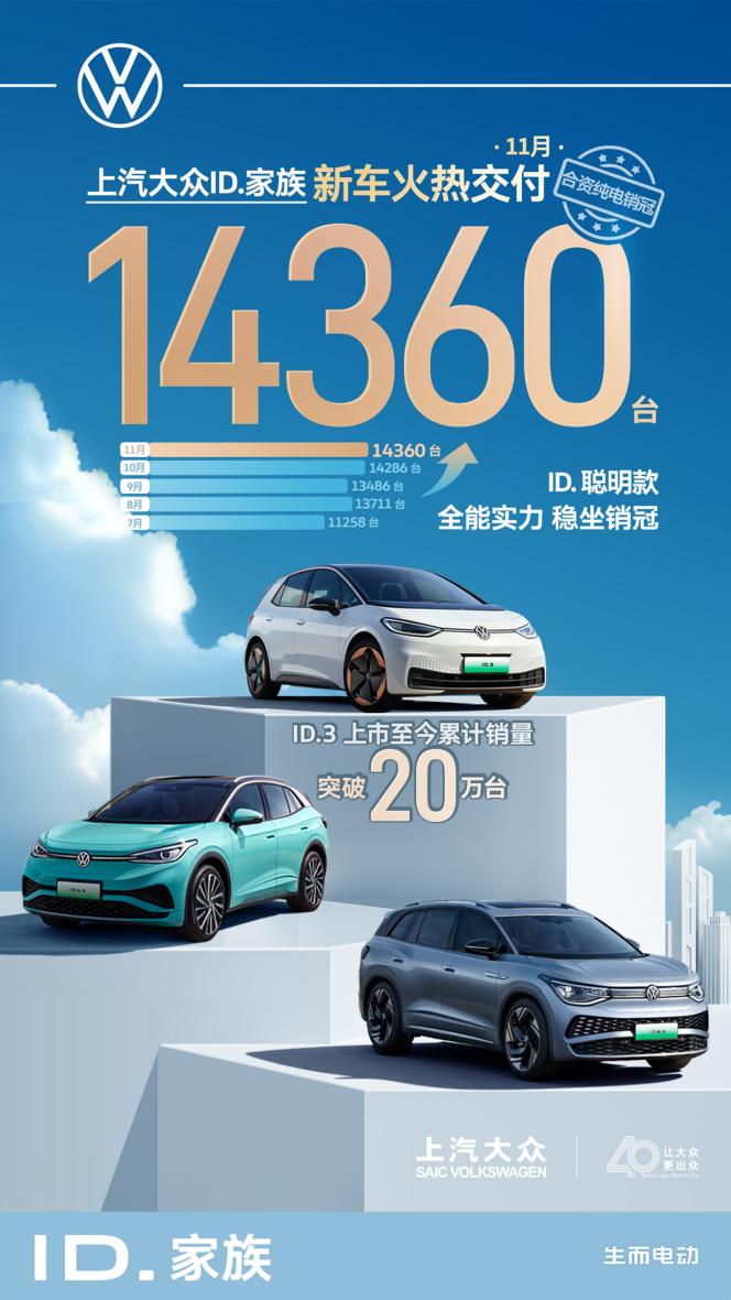 作为上汽大众新能源产品的销量担当,ID.家族11月新车交付14,360辆。凭借外观设计、出众操控和与时俱进的智能化水平,大单品ID.3持续旺销,截至目前累计销量已突破20万辆。依托高品质纯电ID.家族,上汽大众年轻化版图也在加速扩张。近日,ID.3 KPL选手定制款公益拍卖晚会高燃举办,上汽大众与KPL共创推出的4 款全球唯一的ID.3 KPL选手定制款,通过现场爱心拍卖全力支持荒漠化防治公益事业。