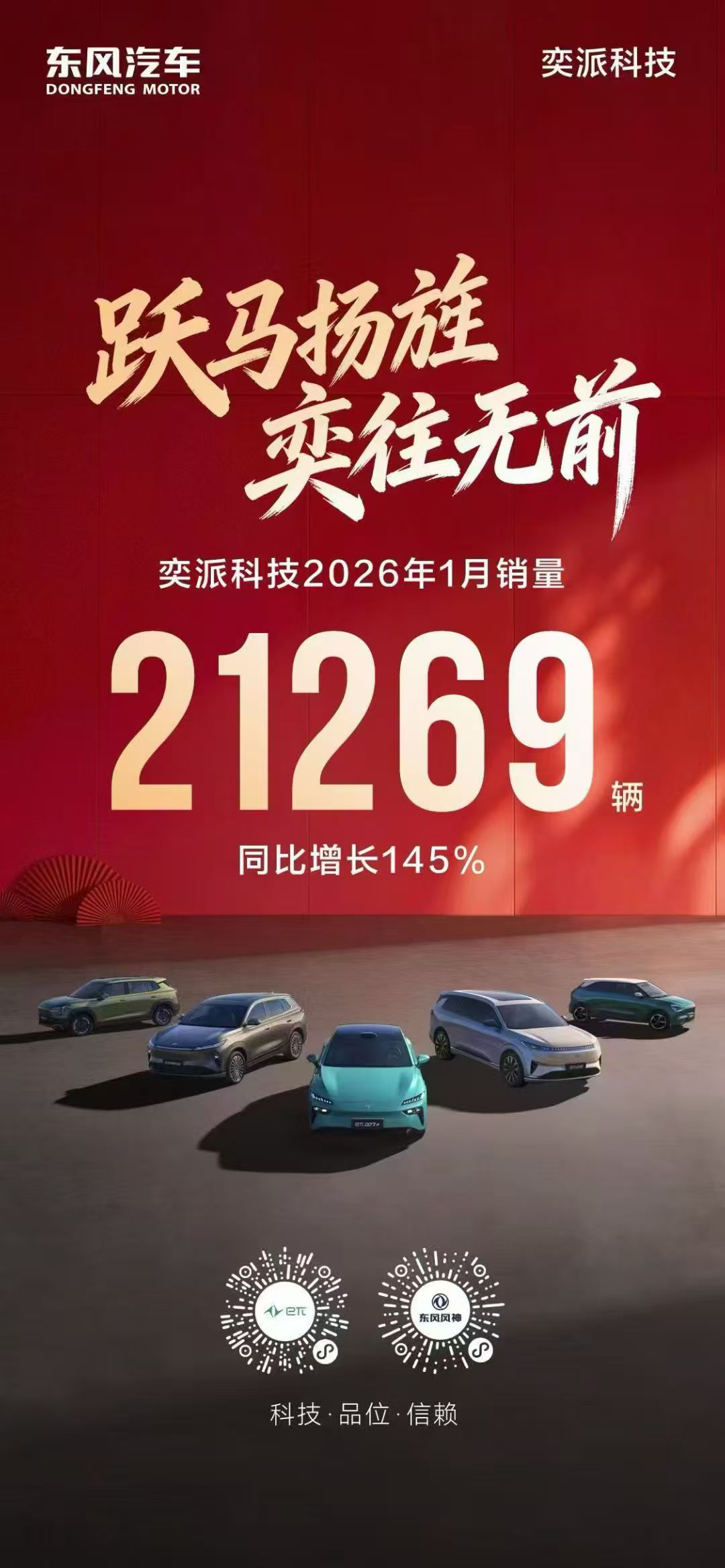 【中国汽车趋势网讯】2月1日,奕派科技公布了2026年首月销量数据,以21269辆的成绩、145%的同比高增幅,顺利拿下新年“开门红”。这份在行业淡季逆势上扬的亮眼成绩单,不仅彰显了奕派科技的产品竞争力与品牌认可度,更成为东风自主新能源事业高质量发展的核心支撑,为当前新能源汽车市场竞争格局注入强劲央企动能,也让外界对其后续品牌升级、技术落地与新品布局充满期待。