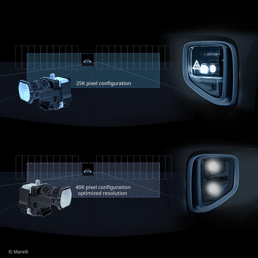 马瑞利 h-Digi® MicroLED 是一款面向智能前照灯系统的高分辨率MicroLED 投影模组,提供25K 和 40K 两种像素配置,可覆盖不同细分车型需求。25K MicroLED 版本是一项成熟、紧凑且高能效的解决方案,可支持高精度 ADB、自适应前照明功能、道路投影以及动态灯光动画。马瑞利将在本次车展上发布40K MicroLED 版本并同步开启询价,该版本进一步提升了像素密度与精度,专门面向高端车型应用。