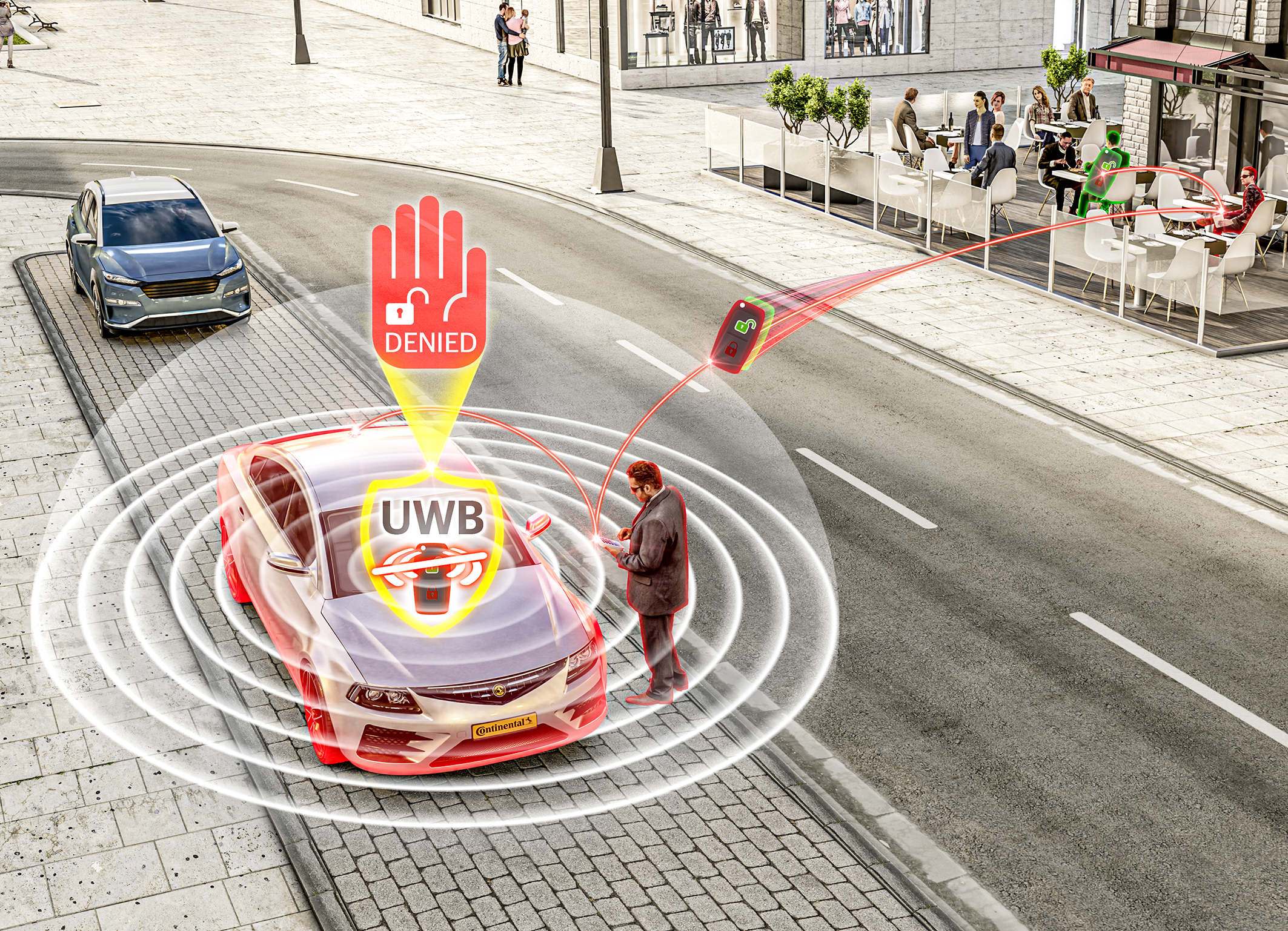 超宽带技术可以防止利用中继(中间人)攻击做出的未经授权的访问,从而使汽车无钥匙进入功能变得更加安全。在这个策略中,攻击者利用无线通信技术扩展车钥匙的无线信号,让车辆误以为驾驶员就在附近。但是,超宽带通信技术可以让驾驶员定位精确到厘米而车辆的进入控制还将使用高精的定位信息。