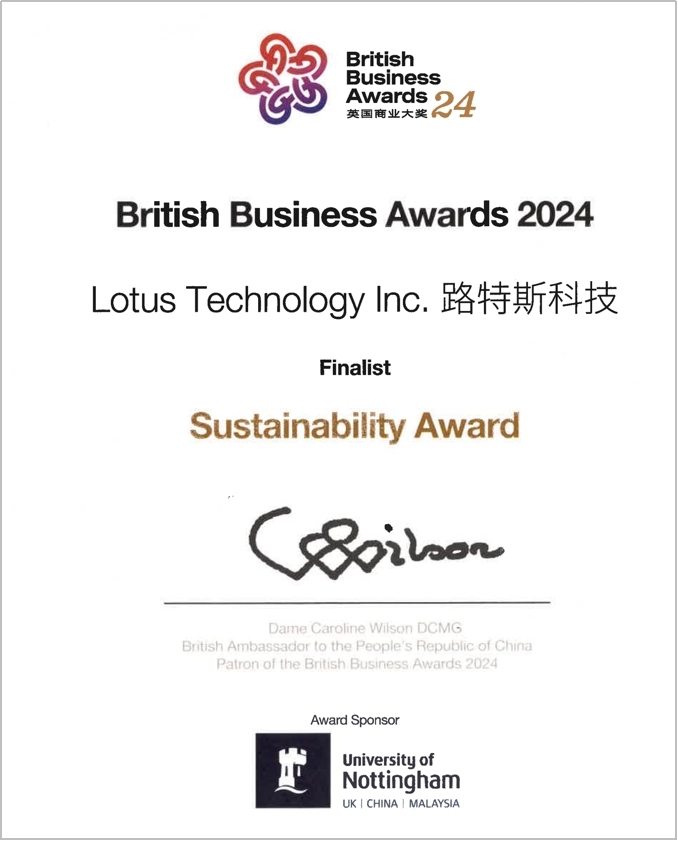 路特斯科技亦凭借对社会和环境负责的商业运营模式,入围了2024年英国商业奖的可持续发展奖决赛。今年公司斩获2024路透社可持续发展大奖的商业转型类别中的高度赞扬奖、2024中国欧盟商会可持续商业大奖脱碳领航者等多个可持续发展环保领域奖项。此次再获佳绩,充分体现了公司在推动可持续发展目标同时对环境保护的重视和成就。路特斯将持续推动企业社会责任和环境保护领域的创新与精进,进一步为行业和社会进步做出卓越贡献。