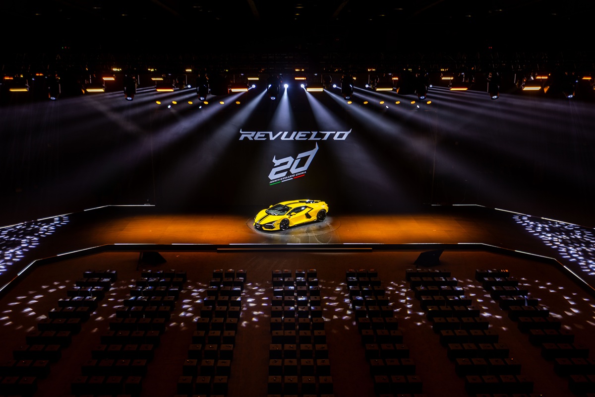 庆典高潮来临,Stephan Winkelmann先生为Revuelto Ad Personam二十周年纪念版揭幕。这台专属车型采用在中国市场备受欢迎的鲜明的Giallo Inti(黄色)外观,象征繁盛、活力与尊贵,并搭配动感的三条Nero Noctis(黑色)拉花涂装,通过大胆撞色彰显速度感与坚定姿态。专属“20周年”纪念徽标呼应兰博基尼在华二十载历程。