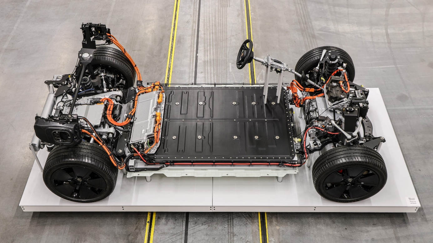 配备全轮驱动的保时捷Macan底盘:总容量为100 kWh的高压电池位于两轴之间。驱动电机分别安装在前轴和后轴上。