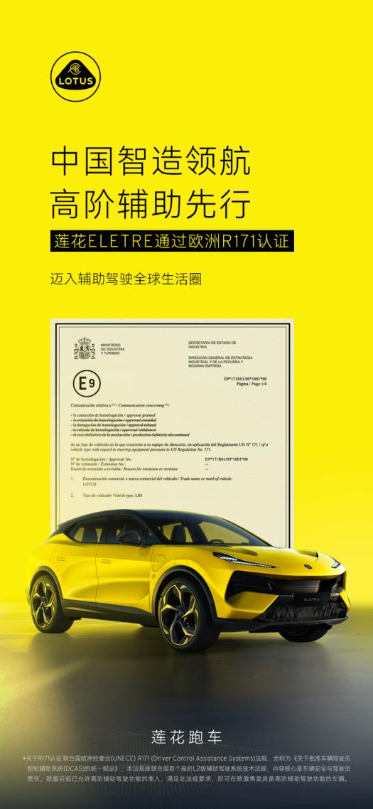 【中国汽车趋势网 3月13日讯】今日,路特斯科技(NASDAQ:LOT )旗下莲花汽车宣布:公司已获得联合国欧洲经济委员会(UNECE)第171号01系列法规(即UN R 171.01)国际法规认证,成为第一家获得该认证的中国车企。由中欧技术团队联合研发的莲花Eletre,计划于2026年6月起通过OTA软件升级方式,向满足条件的车辆分批推送高快路领航辅助功能(HNP)。