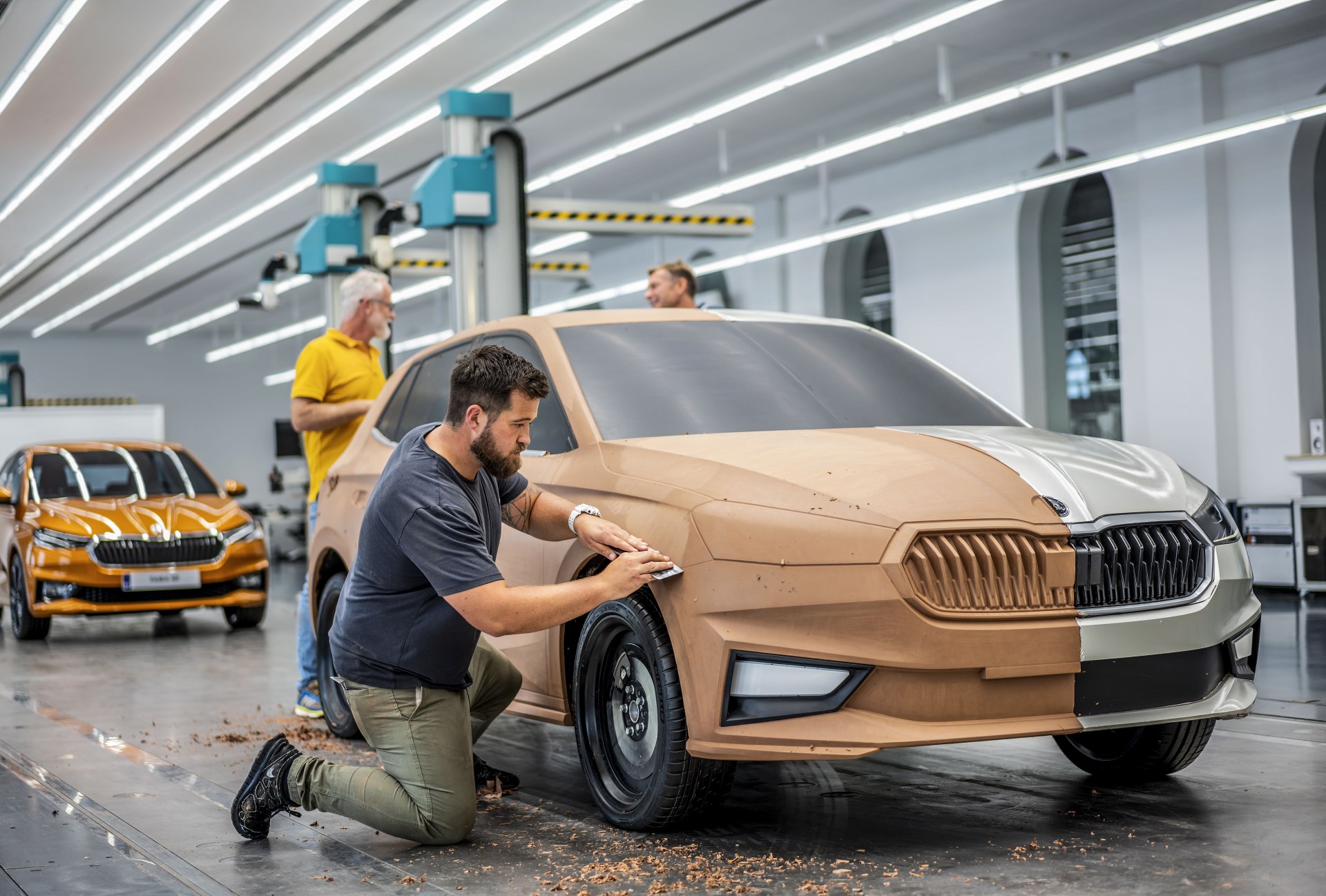 斯柯达汽车的实物模型制作工作由Vlastimil Pa?out牵头主持,负责监督外观、内饰、组件三大工作室的工作。其中,外观工作室是规模最大的建模场所,其大厅最多可容纳七个1:1比例的模型。事实上,为车展和未来将投入量产的车型进行概念设计时,所有工作都是在1:1比例的模型上进行的。在小比例尺度下,有些细节可能无法清晰显现出来。