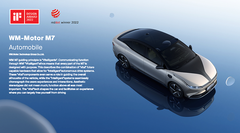 此次获奖的作品全新威马M7融合前沿科技与设计革新,完美诠释了威马汽车的设计理念和本土品牌在智能电动时代的美学设计价值。值得一提的是,此前威马已多次获得世界重大设计奖项肯定,包括2021年红点奖、2018年iF设计奖。M7同时斩获这两项大奖也是业界对威马工业设计理念的赞赏与肯定。