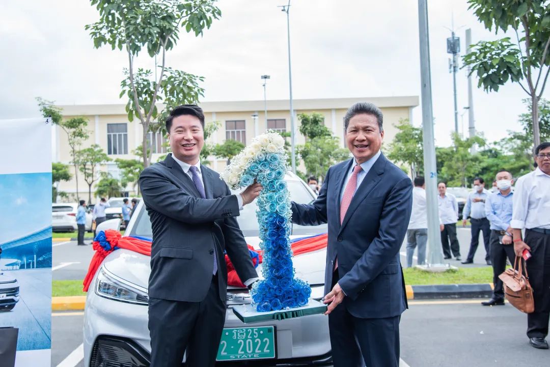11月29日,柬埔寨公共工程与运输部正式举行了电动充电桩落成仪式以及电动汽车交付仪式。此次仪式由柬埔寨公共工程与运输部部长Sun Chanthol主持,比亚迪柬埔寨经销商环亚合众总裁莫莹套参加了此次仪式。同时,交通部向比亚迪采购了一台元PLUS,而这次采购是柬埔寨政府新的尝试——首次采购新能源汽车作为公务用车。