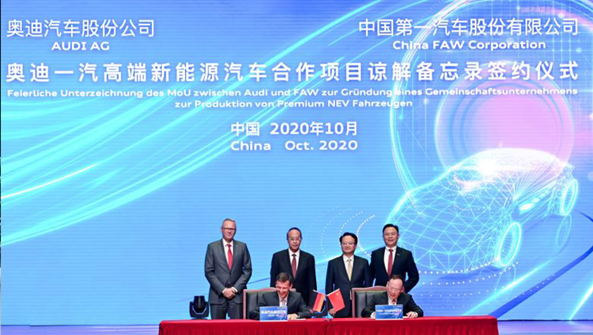 奥迪汽车股份公司携手合作伙伴中国第一汽车股份有限公司在长春举行的中德汽车大会上签署谅解备忘录,宣布共同成立新能源合资公司在华本土化生产PPE平台纯电动车型,将双方合作提升至全新高度。