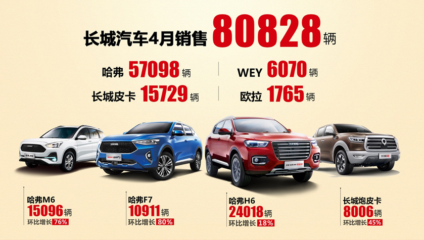 5月8日,长城汽车发布2020年4月销量数据:4月,长城汽车共销售新车80,828辆,环比增长35%。其中,国内销量实现同比、环比双增长,共销售新车78,804辆,同比增长2%,环比增长46%。