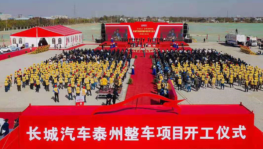 11月11日,长城汽车国内第八个整车生产基地——长城汽车泰州整车项目正式开工建设。长城汽车董事长魏建军发表致辞,泰州市委书记史立军先生、致辞并宣布项目正式开工建设,双方领导共同为项目培土奠基。