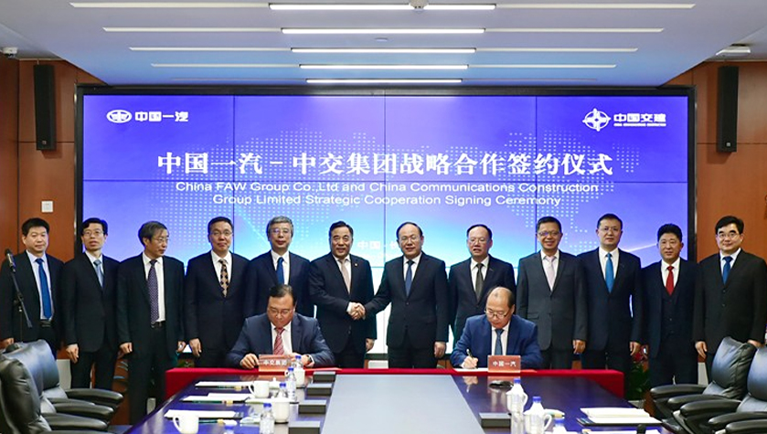 10月10日,中国一汽与中国交通建设集团有限公司战略合作签约仪式在集团公司总部举行,中国一汽董事、总经理、党委副书记奚国华,中国一汽党委常委、副总经理邱现东,中交集团总经理、党委副书记宋海良出席签约仪式。中国一汽总经理助理兼战略管理部部长胡咏与中交集团海外事业部党委书记、执行总经理王京春代表双方签约。