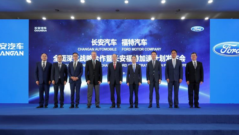 长安汽车与福特汽车全面深化战略合作暨长安福特加速计划发布会在重庆举行。中国南方工业集团公司董事长徐平,福特汽车公司汽车业务总裁韩瑞麒,南方工业集团副总经理、长安汽车董事长张宝林,和福特汽车公司集团副总裁,福特汽车(中国)有限公司总裁兼首席执行官陈安宁、长安汽车总裁朱华荣出席了发布会并发表致辞。?