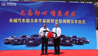 5月29日, “不忘初心,情系老区“长城汽车助力阜平县脱贫攻坚捐赠交车仪式,在河北省阜平县职业教育学校举行。阜平县委常委、副县长雷伯勇及相关领导,长城汽车工会主席兼董事会秘书徐辉出席捐赠仪式。