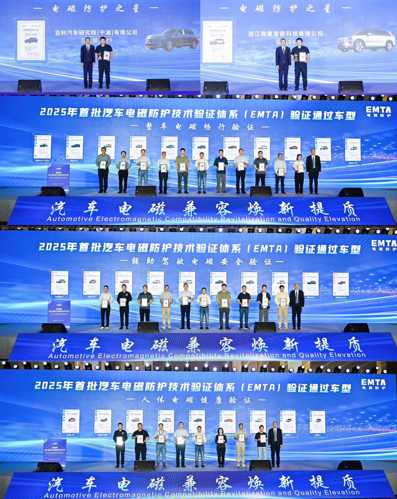会议中,中汽中心新能源检验中心举办了汽车电磁防护技术验证体系EMTA首批车型授证仪式。EMTA基于消费者典型用车场景及电磁安全风险,设立辅助驾驶电磁安全、整车电磁畅行、人体电磁健康三个维度的验证,用于帮助企业在研发阶段发现并解决潜在风险,提升产品电磁安全性能。