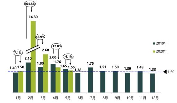 图1 2019-2020年月度汽车经销商库存系数