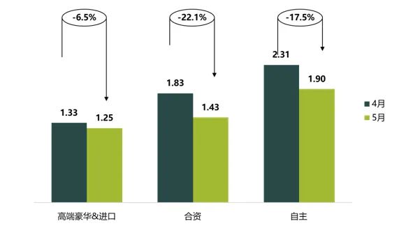 二、高端豪华&进口品牌、合资品牌及自主品牌库存系数环比下降