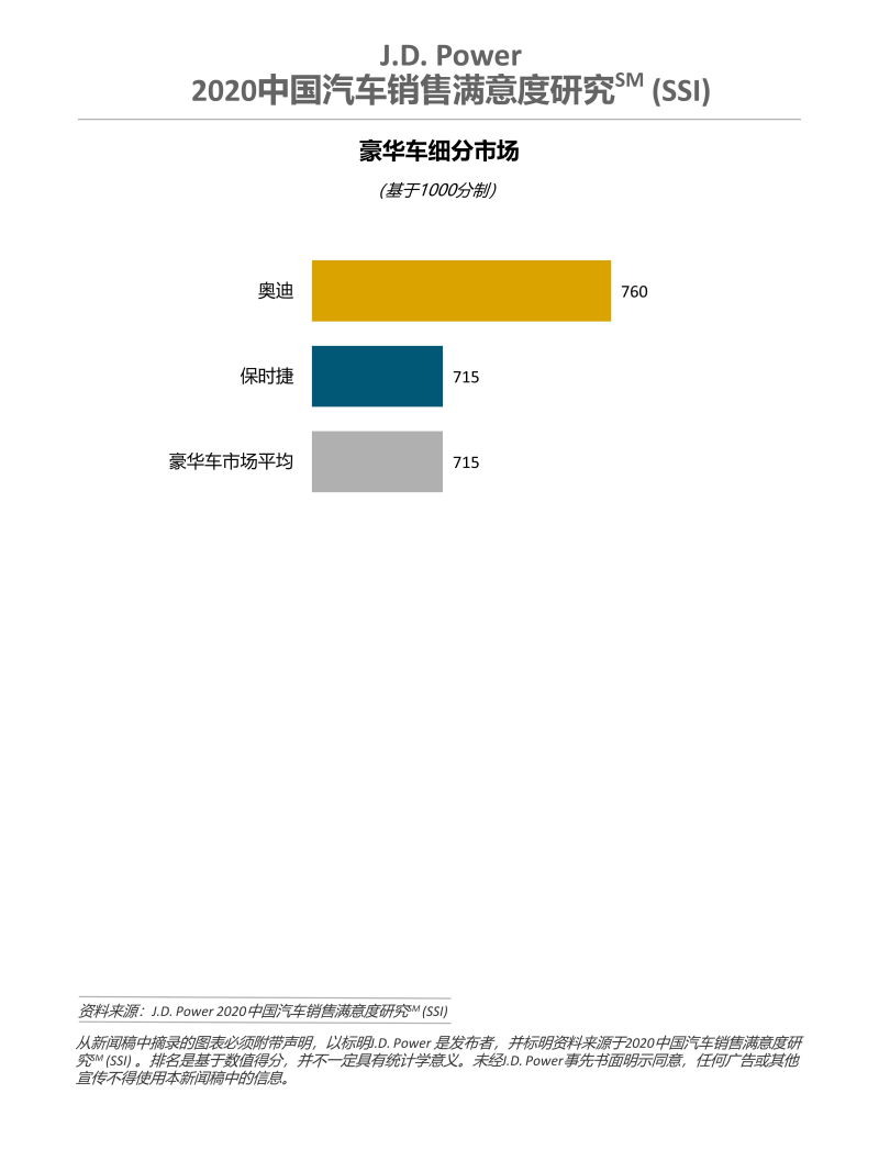 奥迪以760分连续第八年位居豪华车市场销售满意度榜首。保时捷以715分位列第二。