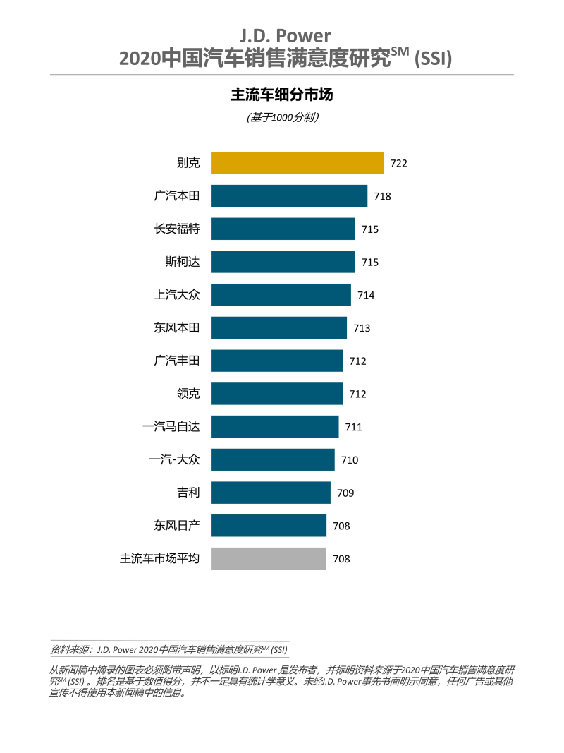 别克以722分位居主流车市场第一名,广汽本田(718分)位列第二,长安福特和斯柯达以715分并列第三位。