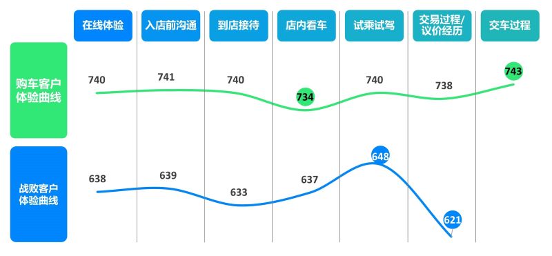 就不同阶段的客户体验而言,2020年研究结果显示,购车客户在购车过程中的体验整体波动不大,店内看车的体验最差,在交车时达到终值体验;而战败客户在试乘试驾时达到全程的峰值体验后,在议价环节的满意度跌到最低。