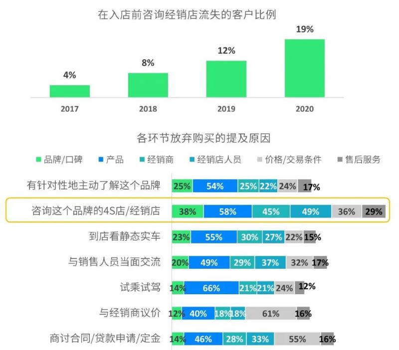 第一个阶段的流失率与汽车品牌的关系更为密切,它意味着品牌需要在产品定位和对外传递信息时就准确把握消费者的需求和兴趣点。后一个阶段的流失率与经销商更相关。研究发现,在入店前咨询环节放弃购买的原因中,产品和经销店人员是导致客户流失的最主要原因。其中,没有想要的车身类型、逐渐发现车型不合适和担心产品质量等是在该环节放弃购买的最主要因素。