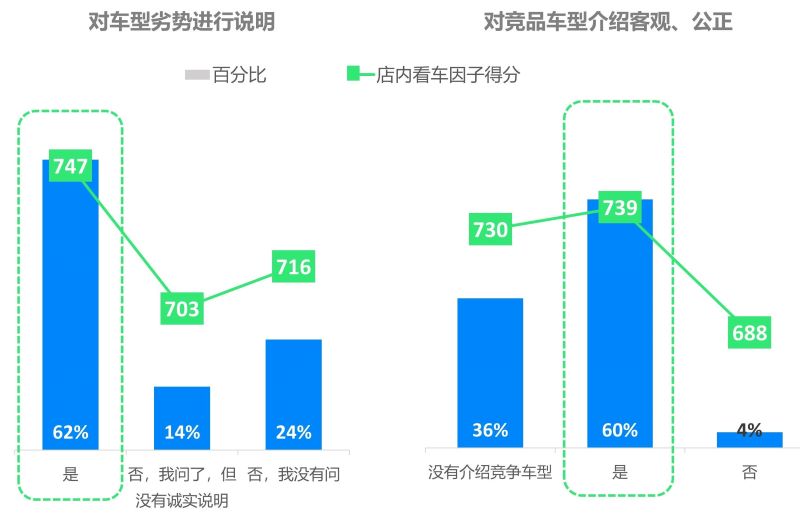 信息透明的时代,客户对车辆与竞品都有着一定的了解。客观公正地向客户讲解和比较产品,更容易获得客户的信任。研究显示,如果讲解人员在客户看车过程中对车辆劣势进行详细说明,其满意度(747分)远高于未诚实告知车辆劣势的满意度(703分),此外,讲解人员对竞品车型进行客观公正对比的满意度(739分)也高于失实、不客观的比较(688分)。