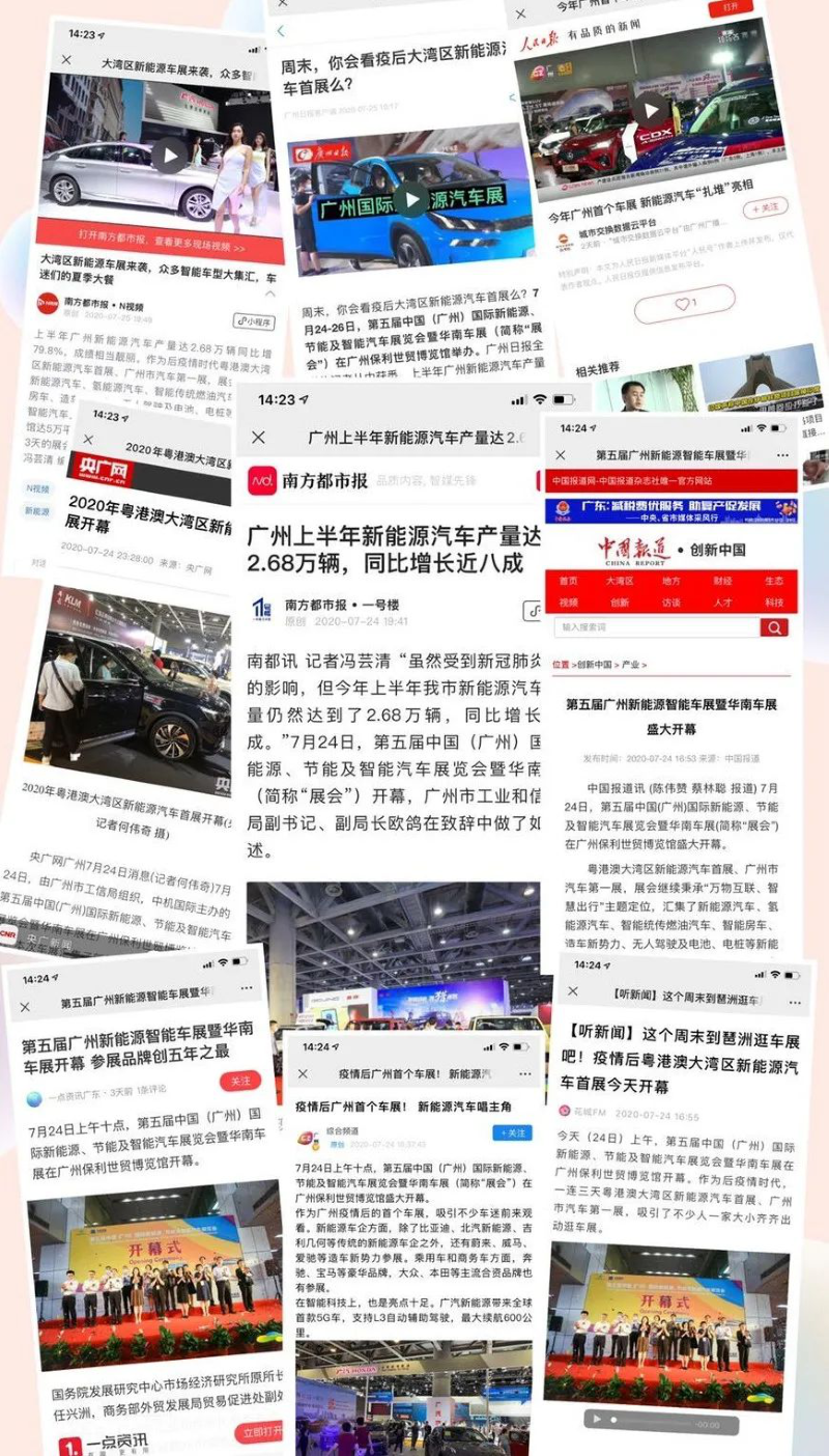 本届展会参与报道和宣传媒体达105家,其中广州电视台在报道中提到广州新能源车展作为今年广州首个车展,新能源“扎堆”,受到广泛关注;花城FM在报道中由于是疫情后首次新能源汽车展,加上广州实行购车补贴新政、提振新能源汽车消费的背景,本届车展的人气比往届更旺。即使在周五工作日的车展首日,不少人还是一家大小齐齐出动,一起逛车展;爱买车网在报道中提到新能源车展参展品牌阵容创五年之最,充分满足消费者买车需求。