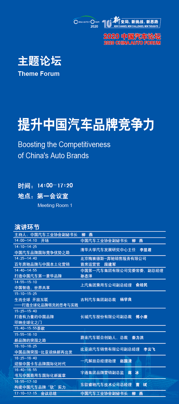 中国第一汽车集团有限公司党委常委、副总经理孙志洋演讲的主题为“打造中国汽车第一豪华品牌”,上汽乘用车副总经理俞经民演讲的主题为“中国智造,世界共享”,吉利汽车集团副总裁杨学良将从“生而全球 开放互联——打造全球化品牌领克的思考与实践”方面提出品牌建设实践经验,长城汽车股份有限公司副总裁傅小康的演讲主题为“打造有力量的中国品牌,叩响全球化之门”,蔚来汽车联合创始人、总裁秦力洪的演讲主题为“新品牌的突围之路”。