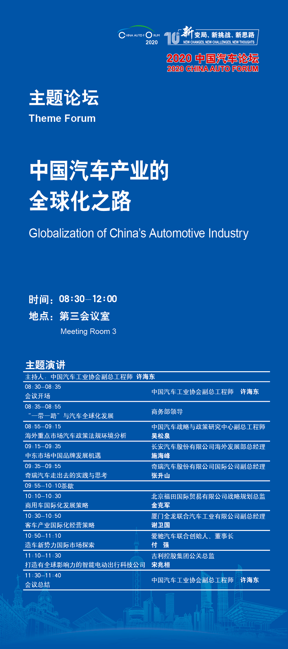 长安汽车股份有限公司海外发展部总经理施海峰的演讲主题为“中东市场中国品牌发展机遇”,奇瑞汽车股份有限公司国际公司副总经理张升山将以“奇瑞汽车走出去的实践与思考”为主题进行分享,北京福田国际贸易有限公司战略规划总监金克军的演讲主题为“商用车国际化发展策略”,厦门金龙联合汽车工业有限公司副总经理谢卫国的演讲主题为“客车国际化发展策略”,吉利控股集团公关总监宋兆桓的演讲主题为“吉利汽车全球化发展之路”,爱驰汽车联合创始人兼总裁付强将以“造车新势力国际市场探索”为主题做分享。