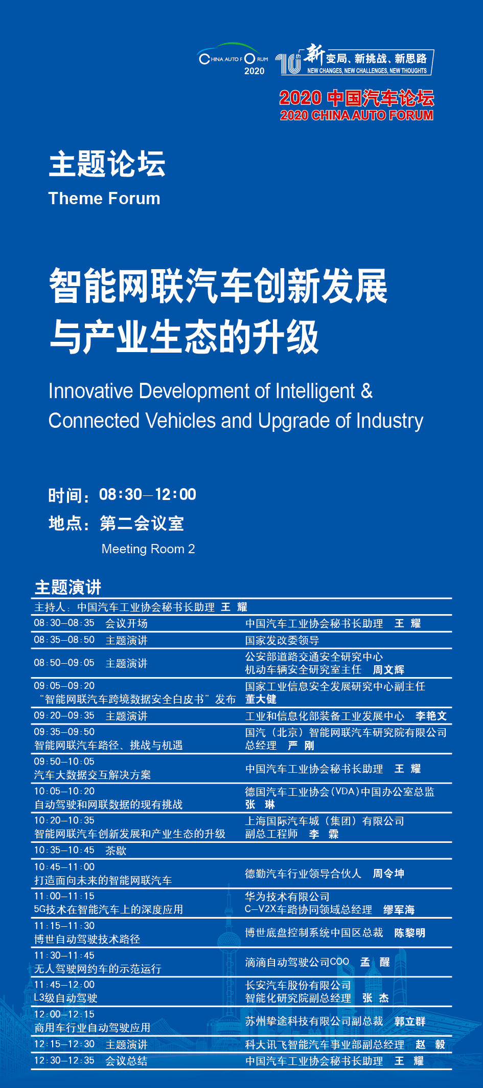 2020年中国汽车论坛将以“智能网联汽车创新发展与产业生态的升级”为主题设置分论坛,邀请行业专家和企业共同探讨如何推动智能网联汽车创新发展与产业生态升级。