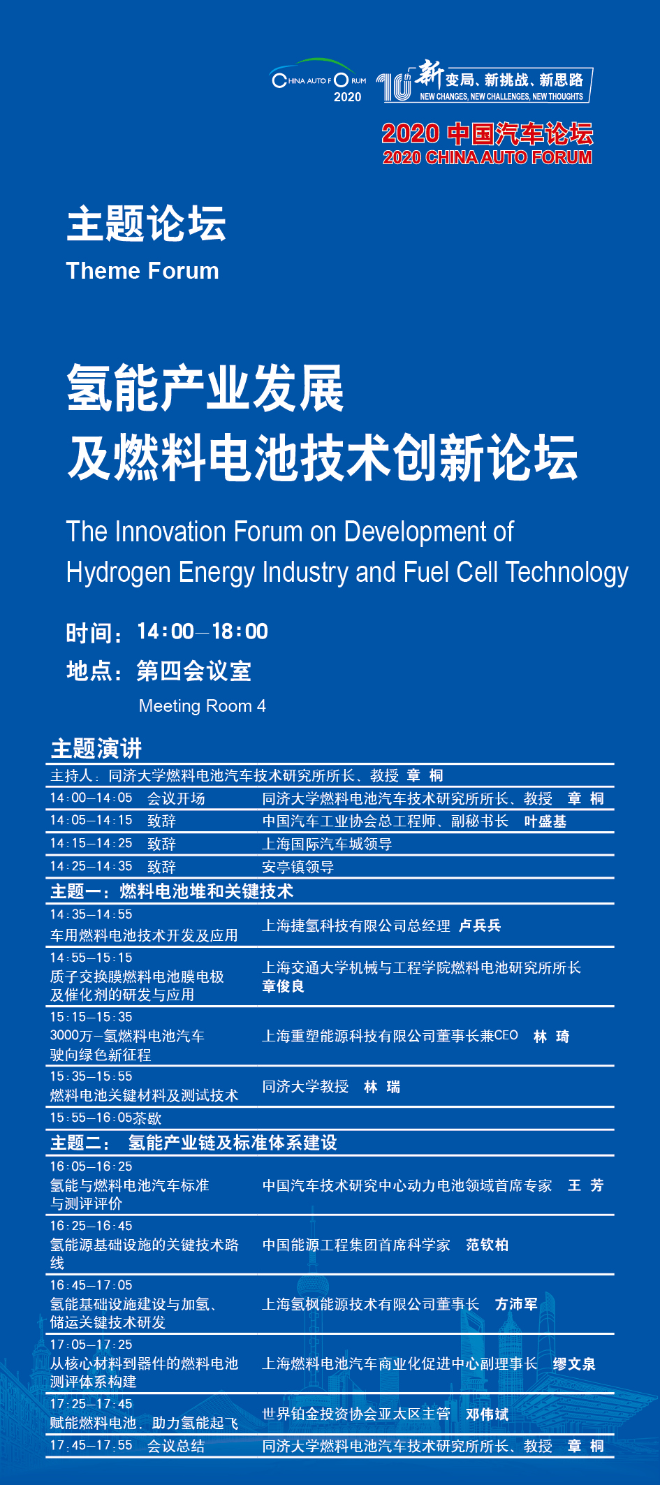 该主题论坛将于2020年8月14日下午举办,同济大学燃料电池汽车技术研究所所长、教授章桐作为权威专家担任本场论坛的主持人。中国汽车工业协会总工程师、副秘书长叶盛基、上海国际汽车城领导及安亭镇领导将分别致辞。