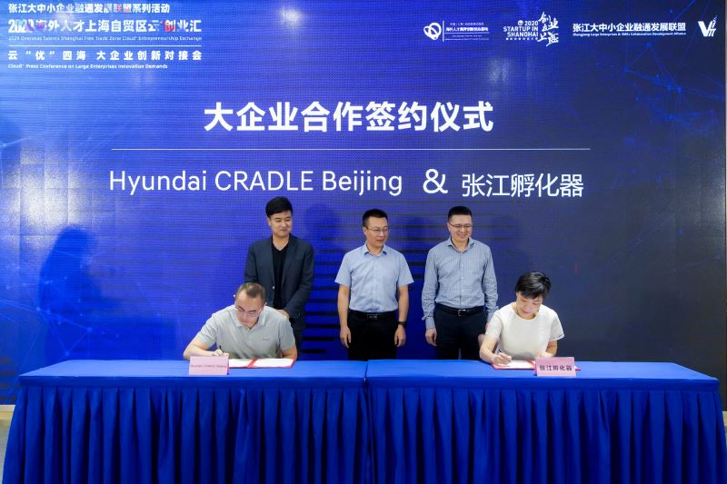 在上海张江高新技术创业服务中心主任雷亚洲和上海张江科技创业投资有限公司总经理余洪亮的见证下,Hyundai CRADLE Beijing总经理杨萍和张江孵化器总经理张泓斐共同签署创新战略合作伙伴协议。双方将开放创新资源,Hyundai CRADLE Beijing分享现代汽车集团在汽车出行产业及创新生态领域的经验,张江孵化器协同浦东新区及上海的创新网络,共同赋能和加速优秀初创企业的发展。