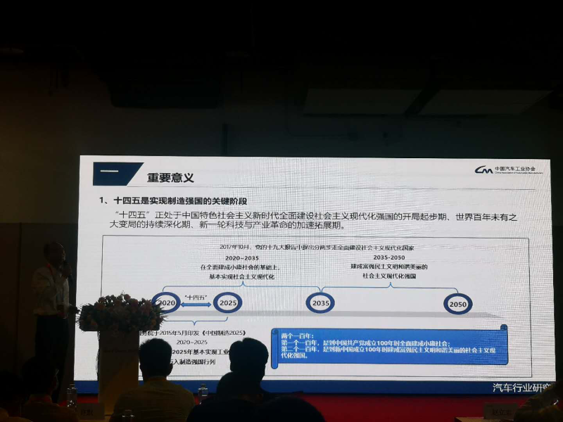 师建华秘书长进行了《汽车工业十四五规划意见(讨论稿)介绍》的主题演讲,“十四五”是国家两个百年奋斗目标的历史交汇期,是汽车产业转型升级的关键窗口期,新一轮技术革命为产业转型提供了广阔空间和无限机遇,新冠疫情增加了产业转型难度,同时也倒逼产业加快转型速度,汽车产业必须抓住未来5年战略机遇期,在危机中育新机,建设发挥引领作用的汽车强大市场,创造汽车产业发展新机遇,在变局中开新局,加快形成健康的国内产业大循环,开拓汽车产业全球化新局面,引领汽车产业迈向新征程。