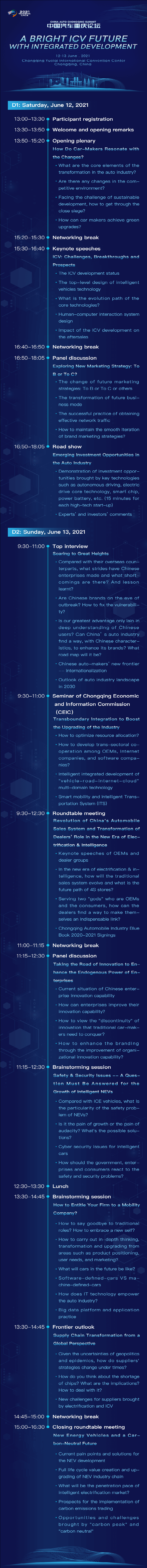 本届中国汽车重庆论坛,第一次分别为主流国企汽车集团、风头正劲的独立品牌车企、造车新势力安排三场重磅全体会议;第一次引入智库为行业创新能力建设出谋划策;第一次把活跃在汽车科技浪潮前沿的初创企业请进来举行路演、并让行业知名投资机构担任评判人;第一次在疫情常态化的背景下把论坛的国际化提升到一个新高度,不仅有众多的跨国公司高管与会发表演讲,还会有境外嘉宾通过视频连线方式参与相关环节的讨论;第一次把美国密歇根、印第安纳、南卡罗来纳、北卡罗来纳、加利福尼亚五个州的驻华代表组成的代表团邀请到现场为促进中美经贸合作展开坦诚的对话……可以预见,它将是一个高朋满座、高潮迭起的高峰论坛,它必将赋能行业健康发展、成为行业里一道特色鲜明的精神大餐 。