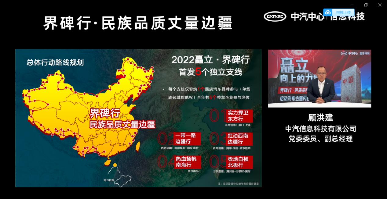 本次发布会,中汽信息科技有限公司科党委委员、副总经理顾洪建对2022界碑行·民族品质丈量边疆的项目背景、活动内容及路线规划进行讲解。发布会发布了界碑行的五条独立支线,囊括祖国东南西北不同的方位,每条支线由一个民族汽车品牌独立领跑,时间线贯穿整个下半年,从接天莲叶无尽盛夏,到江枫渔火的爽朗清秋,再到瀚海阑干百丈冰雪,走近边界,开阔眼界。通过此次万里征途不仅体现了爱国精神与公益情怀,更通过穿越无人区,挑战地理极限的过程,在高原、沙漠、寒地等严苛环境的考验下,充分展示民族汽车的硬核实力,彰显大国的汽车工业崛起与“中国制造”的力量,唤醒国人民族汽车品牌情怀,并不断推动国内汽车行业高质量发展。