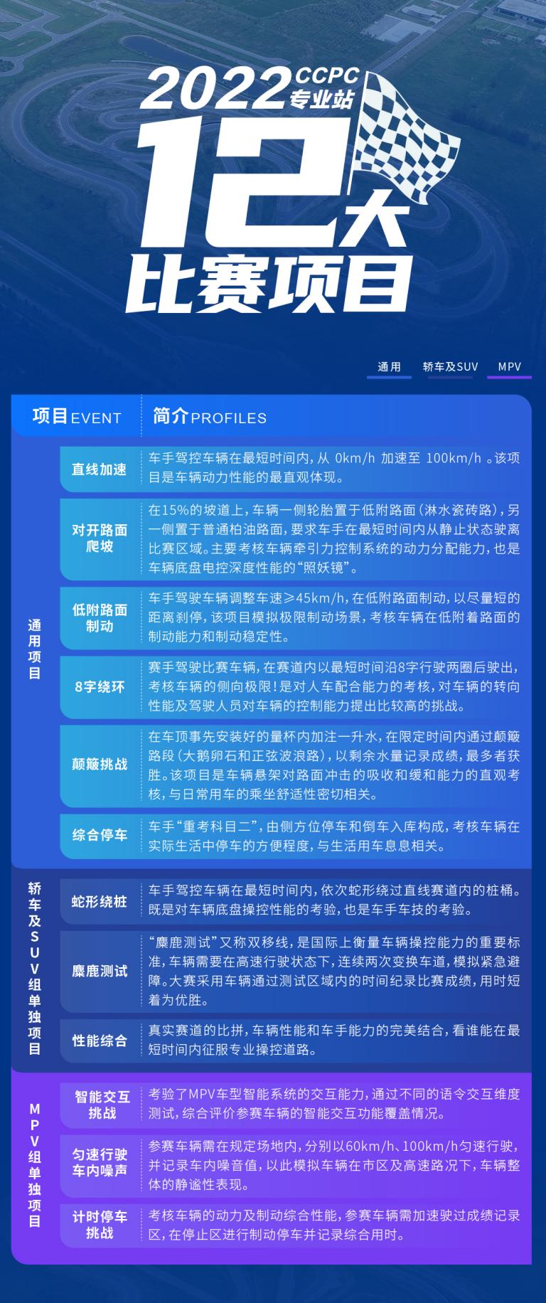【中国汽车趋势网 8月15日讯】在人潮涌动、热力爆棚的2022 CCPC中国量产车大赛(以下简称:CCPC)公众站赛段正式结束后,8月25日-28日,CCPC专业站的比拼即将在江苏连云港拉开帷幕。本次大赛以市场销量高、关注度高的热门新车型为基础,集结了来自各大厂商的20余款主流车型参赛,围绕量产车极限性能展开12大项目的激烈竞逐,一场规模盛大的专业汽车赛事即将打响。