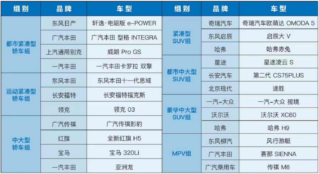 为了给消费者提供更全面、客观的购车参考,大赛组委会力争让更多主流车型参与到赛事中来。依据不同价位区间、不同车型级别以及不同排量等条件,将参赛车型分为都市紧凑型轿车组、运动紧凑型轿车组、中大型轿车组、紧凑型SUV组、都市中大型SUV组、豪华中大型SUV组、MPV组7大组别。根据不同车型,大赛专门设置了12项(所有车型通用6大项目,轿车及SUV组3大专属项目,MPV组3大专属项目)专业、严苛的赛事挑战,在还原车主用车需求、使用场景的基础上,通过国家级裁判团队和严格的赛事评价标准,充分考核车辆的动力性、安全性、操控性、舒适性等多维性能。