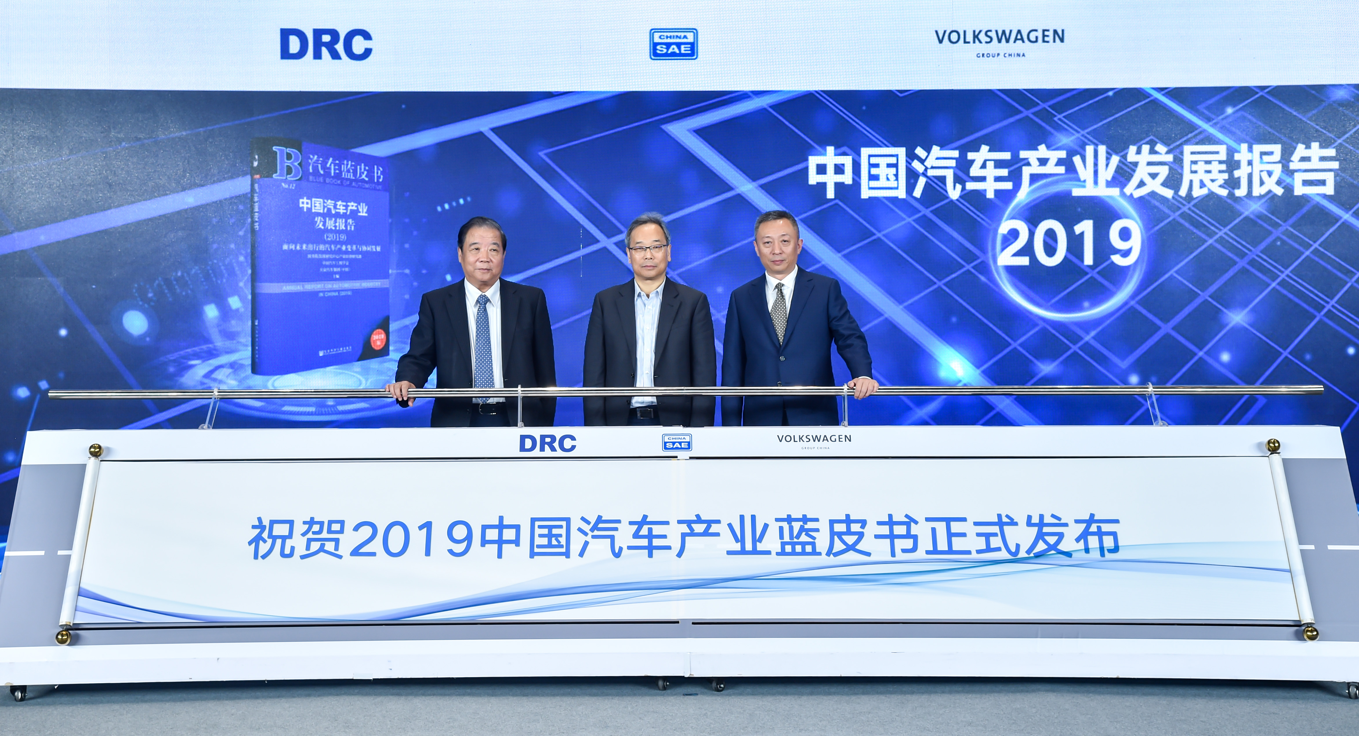 中国汽车工程学会名誉理事长付于武先生、国务院发展研究中心产业经济研究部部长赵昌文先生、大众汽车集团(中国)执行副总裁刘云峰博士共同发布《中国汽车产业发展报告(2019)》(从左至右)