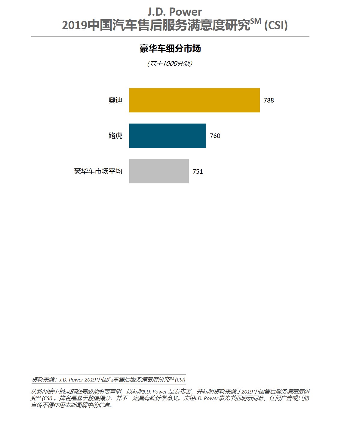 奥迪以788分位居豪华车细分市场售后服务满意度榜首。路虎以760分排名第二。