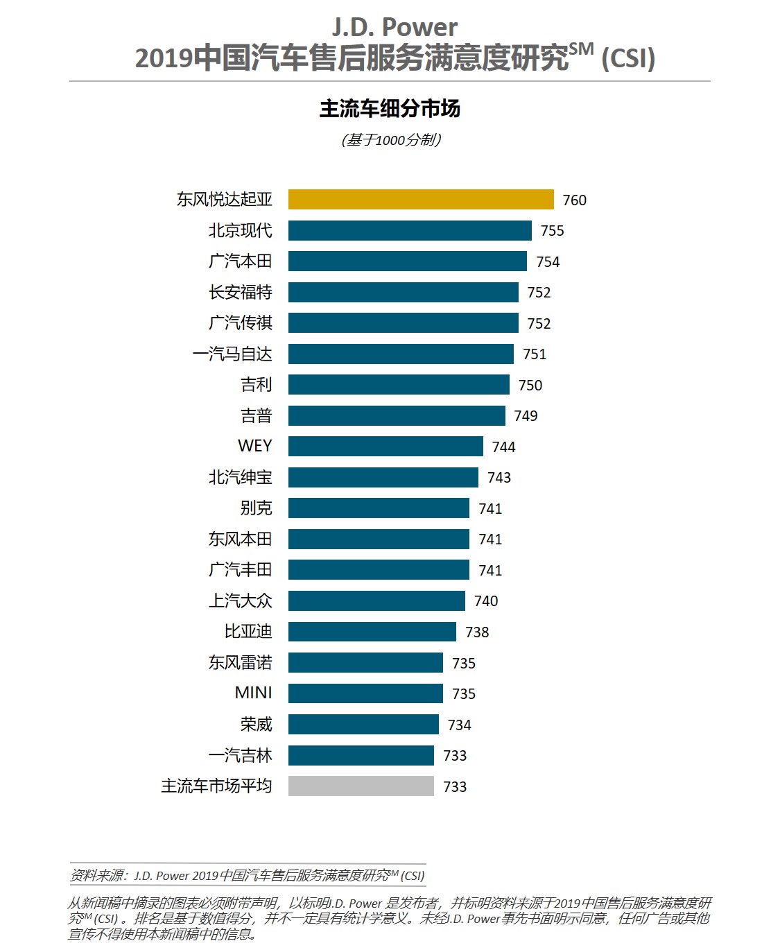 东风悦达起亚以760分位列主流车细分市场第一名,北京现代(755分)和广汽本田(754分)分列第二和第三。排名前十的主流车细分市场中有四个自主品牌,分别是广汽传祺(752分)、吉利(750分)、WEY(744分)和北汽绅宝(743分)。