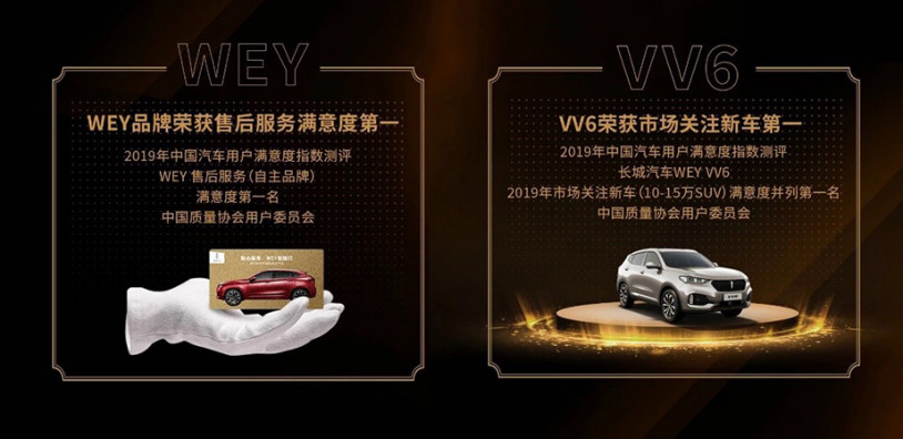 近30万用户选择了WEY品牌,是基于对WEY品牌从产品技术到实感豪华、从卓越品质到至臻服务的全面信任,3年来,WEY品牌也得到众多第三方权威机构认可。在2019年“中国汽车用户满意度测评(CACSI)”中,WEY品牌揽获“中国汽车用户满意度”两项冠军,其中WEY品牌摘得年度售后服务满意度第一的桂冠,VV6摘得“2019年市场关注新车(10-15万元SUV)”满意度头名;在易车研究院发布的配置标配率排行榜中,WEY品牌旗下三款车型也居于首位,让顶配成为消费者们的“标配”;在汽车之家新车质量排行榜中,WEY品牌从合资、豪华品牌的整体市场中脱颖而出,以绝对实力长年雄踞榜首;在JD Power 2019年中国新车质量排行榜中,明星车型VV6成为中型SUV组的冠军。