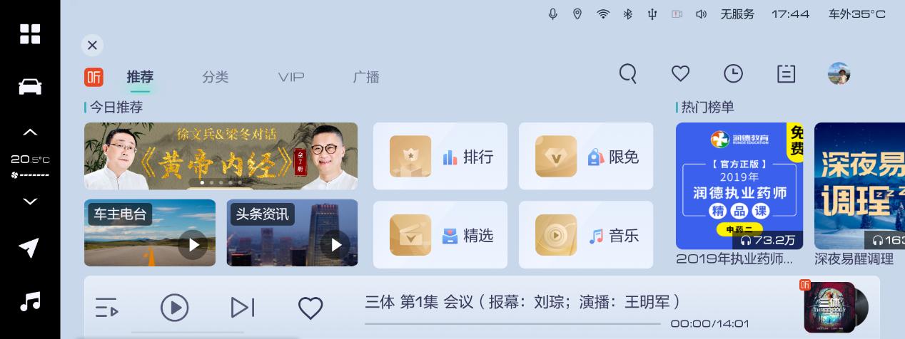 在界面呈现上,UI风格全面优化,支持日出/日落模式,喜马拉雅界面可跟随系统界面风格主题进行自适应切换,让界面更加一致统一;打通了喜马拉雅APP与车机语音系统的互联,支持喜马拉雅应用界面的“可见即可说”,支持用户对语音进行界面的选择、播放、切换等一系列控制。