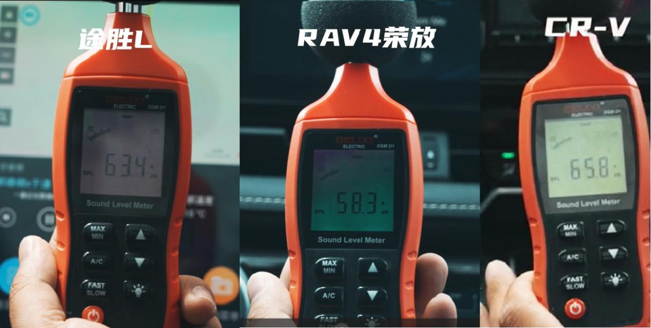 最终测试结果显示,一汽丰田RAV4荣放的噪音分贝为58.3dB,排名第一位;第五代途胜L的噪音分贝为63.4dB,排名第二位;东风本田CR-V的噪音分贝为65.8dB,排名第三。