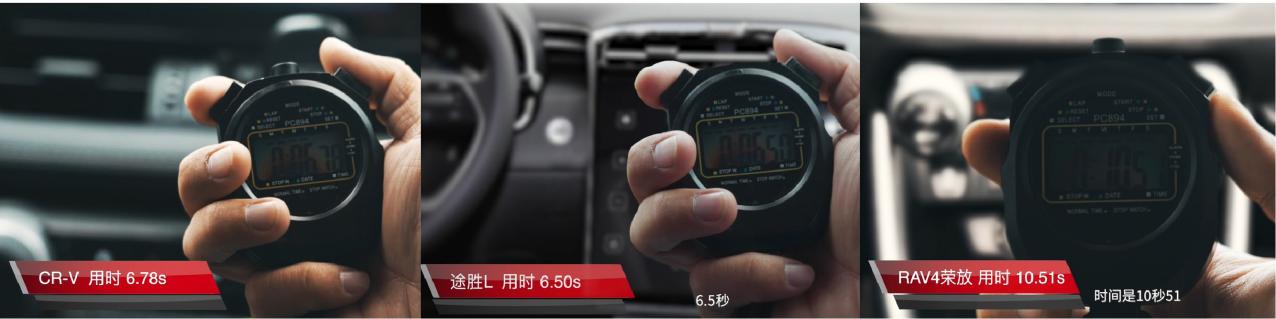 东风本田CR-V同样搭载1.5T发动机,与之匹配的CVT变速箱以顺滑体验见长,急加速时动力迟滞稍显明显,起步、初期提速表现稍逊于第五代途胜L,最终以25.1s的排名第二;一汽丰田RAV4荣放搭载的2.0L自然吸气发动机,缺少涡轮增压动力补偿,提速表现呈线性上升,最终以29.5s排名第三位