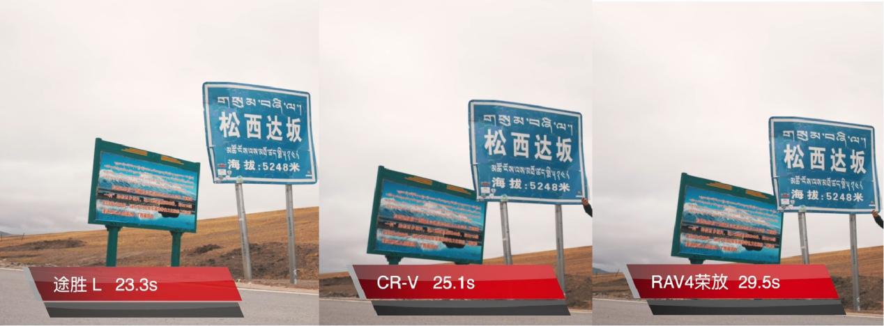 最终测试结果显示,第五代途胜L以6.50s的成绩排名第一位,发动机性能在高海拔地区依然表现出色;东风本田CR-V则以6.78s排名第二;一汽丰田RAV4荣放由于搭载的是自然吸气发动机,提速动力衰减明显,只获得了10.51s的成绩,排名第三位。