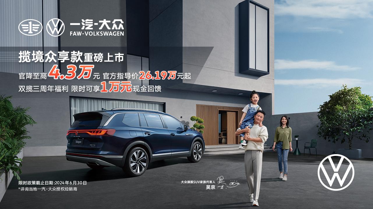 【中国汽车趋势网 6月7日讯】2024年6月一汽-大众揽境上市三周年之际,为回馈广大用户的支持与期待,大众旗舰SUV家族揽境、揽巡联袂推出众享款车型,指导价全系官降至高可达4.3万元,并加享限时1万元现金回馈。此外,现在试驾购车还额外可享至高2.3万元置换补贴(含国补)、蓝牙数字钥匙并有机会抽取阿勒泰试驾活动的名额。