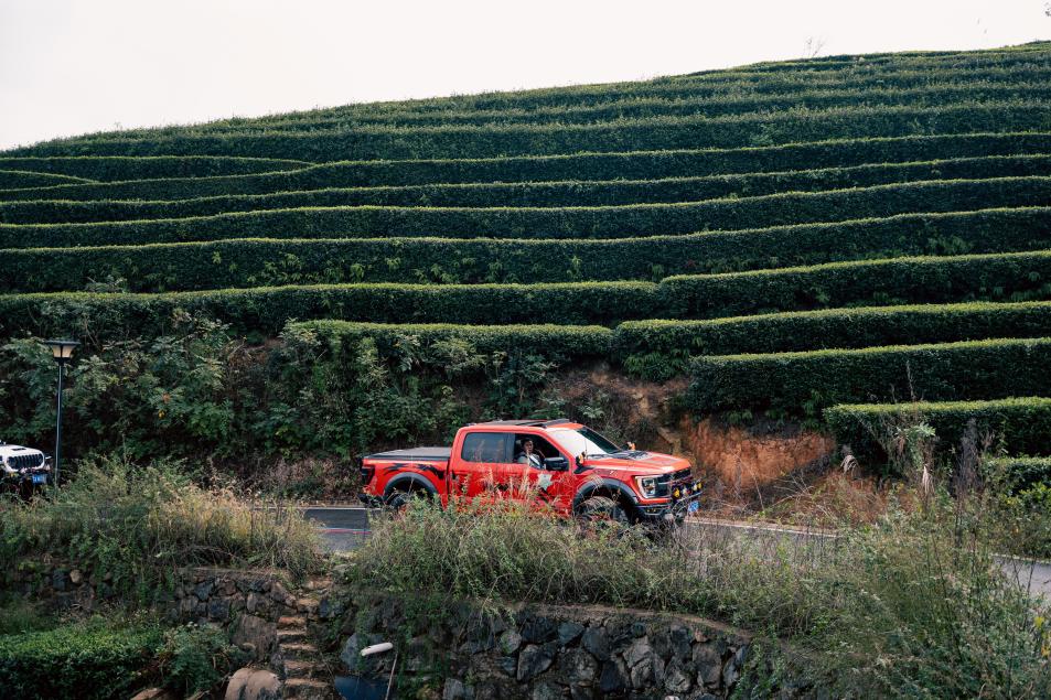 随后,真正的越野冒险从穿越万亩茶园开始。车队驶过连绵的山丘,进入茶园那一望无际的翠绿之中。这里的山路蜿蜒起伏,泥泞与碎石遍布,而F-150猛禽的四驱系统和全地形轮胎展现了强大的越野适应性,让车主们在驾驶过程中感受到前所未有的驾驭快感。