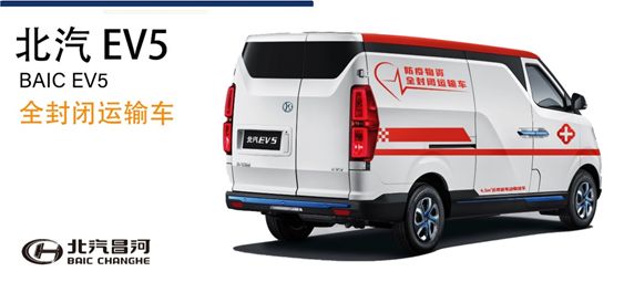 北汽EV5防疫物资全封闭运输车,货舱全封闭隔离,运输途中能有效防火、防水、防盗、防污染,稍加改装可作疫苗等防疫专用物资的运输。车内还配备了紫外线消毒设施,能对空车或在运防疫物资外包装进行消毒。