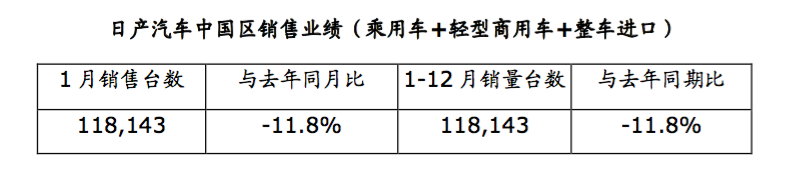 【中国汽车趋势网2月9日讯】日产汽车中国区宣布由于受到中国传统春节假期 提前和新型冠状病毒影响,其包含乘用车和轻型商用车在内的 1 月销量为 118,143 台,同 比下降 11.8%。