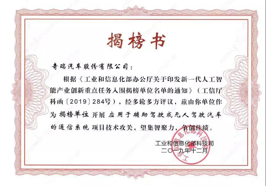 据了解,人工智能产业创新重点任务揭榜工作去年12月份由工信部启动,旨在通过征集并遴选一批掌握关键核心技术、具备较强创新能力的创新主体,按照“揭榜挂帅”的工作机制,突破人工智能产业发展短板瓶颈,加快我国人工智能产业和实体经济深度融合,促进创新发展。此次奇瑞汽车入选,意味着在国家新一代人工智能创新发展中,奇瑞汽车将作为重要的创新主体参与其中。