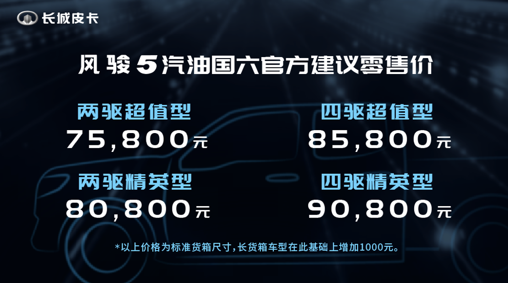 作为中国第一家同时拥有汽、柴油国六车型的皮卡品牌,在本次风骏新品发布会上,长城皮卡风骏5汽油国六和风骏7新冠军版同步上市。